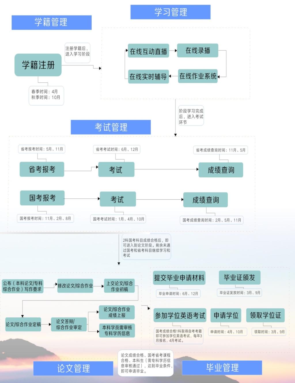 高等教育自学考试是对自学者进行以学历考试为主的高等教育国家考试,是个人自学、社会助学和国家考试相结合的高等教育形式,1981年经国务院批准创立。考生按照专业计划规定的课程和学分完成学业,经思想品德鉴定后,可获得毕业证书,国家承认学历。目前除台湾省外,各省、自治区、直辖市(包括军队)均已开考,是我国规模最大的社会化开放式高等教育形式。论文答辩通过,符合学位授予条件的,自考本科毕业生可由有学位授予权的主考公司依照(中华人民共和国学位条例)等有关文件的规定,授予学士学位。