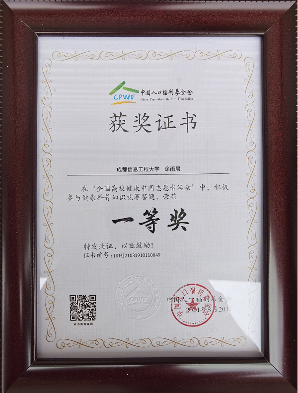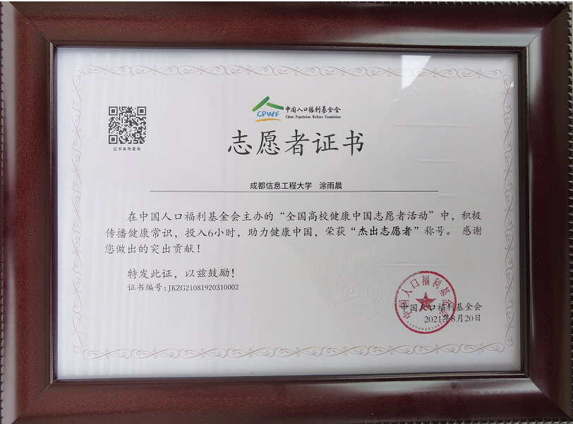 值此建党百年和十四五开局之年,为让更多的青年关注健康问题,普及健康常识,中国人口福利基金会携手国青实践联合发起“全国高校健康中国志愿者活动”。bv伟德国际1946员工涂雨晨积极传播健康知识投入超过6小时,并积极参与健康科普知识竞赛答题,经官方审核通过,荣获“杰出志愿者”称号、获得竞赛答题“一等奖”。